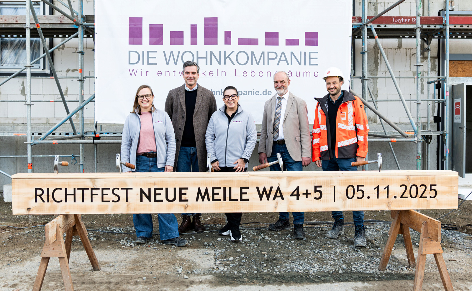 Mit rund 180 Gästen, bestehend aus Handwerkenden, Ingenieur:innen, Architekt:innen, Projektpartner:innen würdigt das Unternehmen den Abschluss der Rohbauarbeiten: Auf den Baufeldern 4 und 5 entstehen mehr als 100 Wohneinheiten: 58 Mieteinheiten, 22 Eigentumswohnungen sowie 27 moderne Stadthäuser. Sie bilden den letzten Abschnitt der von DIE WOHNKOMPANIE Nord verantworteten Bauflächen.